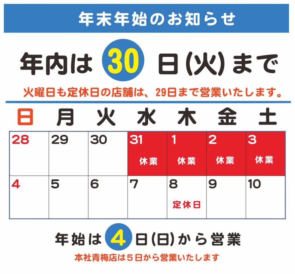 本社青梅店のみ12月30日の最終日は13時30分までの短縮営業となります。