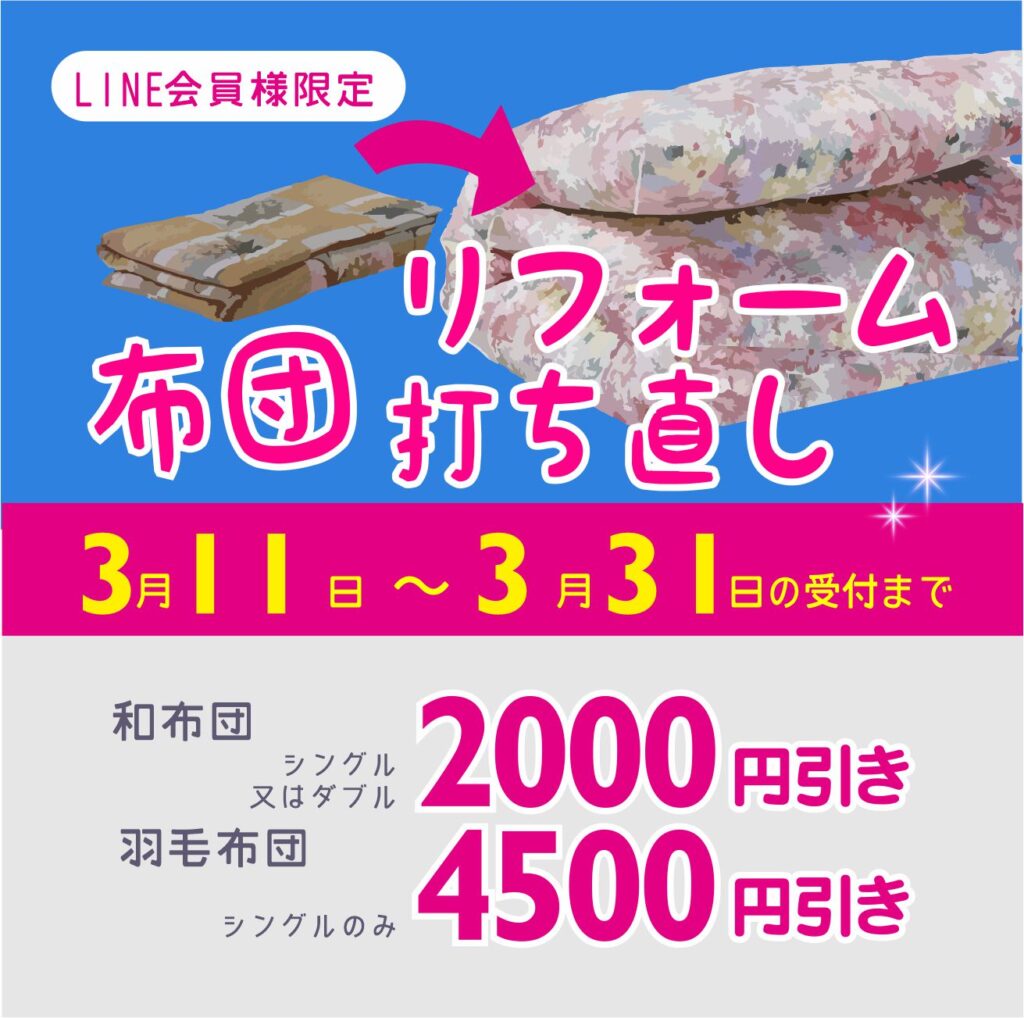 当店は布団の打ち直し・リフォームを手がける専門会社と提携しており、サイズ変更など細かな要望も担当者と直接ご相談いただくこともできます。